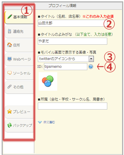 まず左のタブから、一番上の基本情報(赤丸①)を選びます。