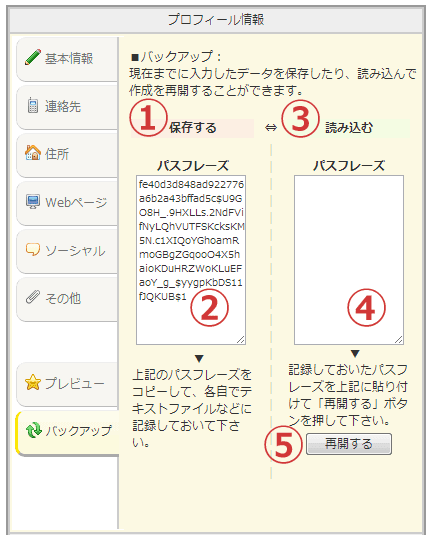 - 赤丸①の保存する部分の、パスフレーズの欄に、文字がコチャゴチャ並んでいますが、これがデータです。