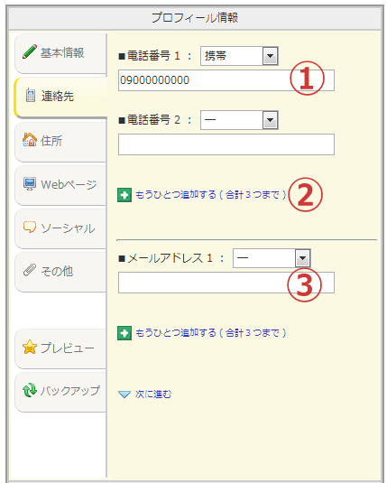 - ②2つ目の電話番号を入れたいときは押してください。3つまで登録できます。